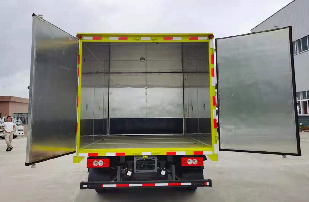 1、该车适用于运输危险品。厢体顶部封闭,不可开启。该车用于运输具有**容器(瓶)包装的爆炸品。类项号:1.1B,1.1G,1.3C,1.1D,1.2D,1.3C,1.1C,1.4G。2、侧,后防护材料均为Q235,螺栓连接;后防护截面尺寸**×50mm。下边缘离地高410mm。厢体侧面选装开门型式及位置,选装不带侧开门,选装瓦楞板结构;厢体侧面板选装开百叶窗。3、随底盘选装排半驾驶室,选装导流罩。仅选用排气管前置、限速装置(限速80km/h)、前轮盘式制动及子午线轮胎的底盘;转向轮装备轮胎爆胎应急防护装置。安装带卫星定位功能的行驶记录仪。ABS系统型号:ABS-VI.E;生产企业:广州瑞立科密汽车电子股份有限公司.ABS系统型号:ABS-E;生产企业:威伯科汽车**系统(**)有限公司。发动机/油耗值(L/**km)对应关系为:CY4SK261/16.09,D30TCIF1/16.19,F2.8NS6B156/15.39,F3.8NS6B156/14.90,Q28-130E60/16.14。可选装ETC车载装置。 |