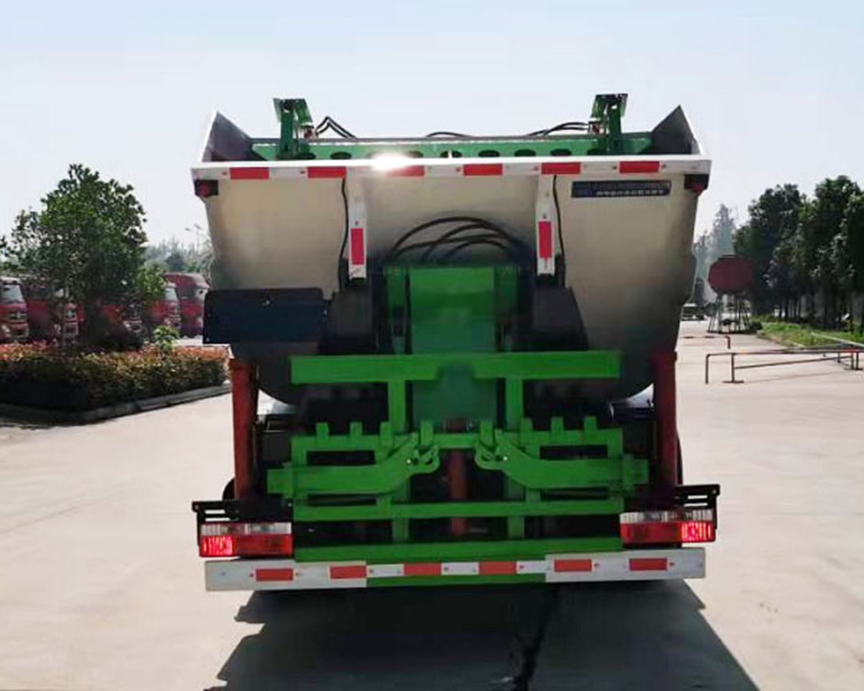 采用后装刮板压缩技术,对生活垃圾大幅度压缩减容。箱体顶部装有刮板,在压缩过程中,推板在推板油缸的作用下,向后进行压缩垃圾。由于刮板设计与箱体底板有**小间隙,保证垃圾进料干净、压缩实在,从而加大垃圾装载量。
